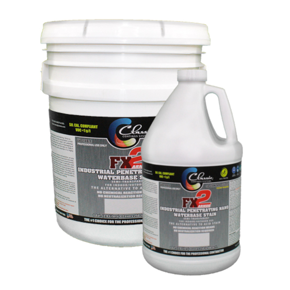 FX2 is a single-component acrylic polymer blend penetrating water-based stain. It provides excellent penetration, UV stability, and it won’t crack, peel, or yellow. It can be applied over cementitious toppings, concrete, masonry, pavers, driveways, and polished concrete surfaces up to 400. FX2 is environmentally safe with no need to neutralize and no fumes or cleanup of hazardous chemicals with VOC and is semi-transparent. FX2 colors reach their full potential within minutes of application and can be built up without the worry of damaging the concrete as an acid stain does. Note that a Classic Sealer must be applied and will make the color more vibrant. For both indoor and outdoor use. We HIGHLY recommend testing a sample area first since results can vary for different surfaces. New concrete must cure for 28 days before applied.